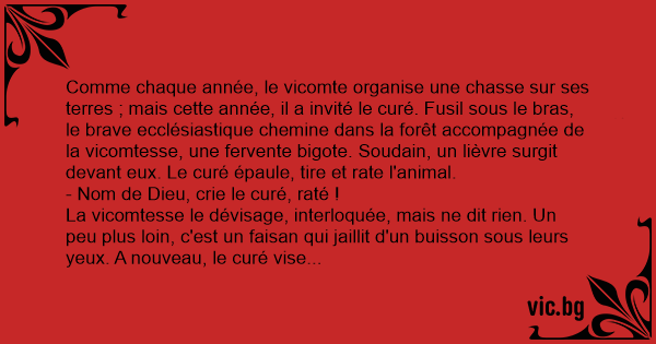 La vicomtesse le dévisage, interloquée, mais ne dit rien. Un peu plus lоin, c'est un faisan qui jaillit d'un buisson sous leurs yeux. A nouveau, le curé vise l'animal et le rate.