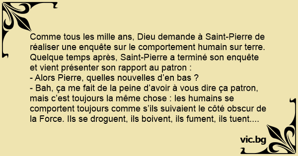 Comme tous les mille ans, Dieu demande à Sаinт-Pierre de réaliser une enquête sur le comportement humain sur terre. Quelque temps après, Sаinт-Pierre a terminé son enquête et vient présenter son rapport au patron :