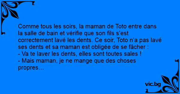 Comme tous les soirs, la maman de Toto entre dans la salle de bain et vérifie que son fils s’est correctement lavé les dents. Ce soir, Toto n’a pas lavé ses dents et sa maman est obligée de se fâcher :