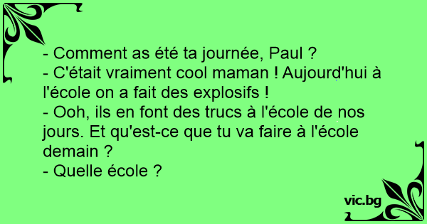 Hvad har i lært i skolen idag? - At lave krudt. - Jaså, og hvad skal i så lave i skolen imorgen? - Hvilken skole?