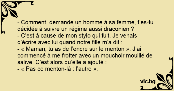 - Comment, demande un homme à sa femme, t’es-tu décidée à suivre un régime aussi draconien ? - C’est à cause de mon stylo qui fuit. Je venais d’écrire avec lui quand notre fille m’a dit : - « Maman, tu as de l’encre sur le menton ». J’ai commencé à me frotter avec un mouchoir mouillé de salive. C’est alors qu’elle a ajouté : - « Pas ce menton-là : l’autre ».