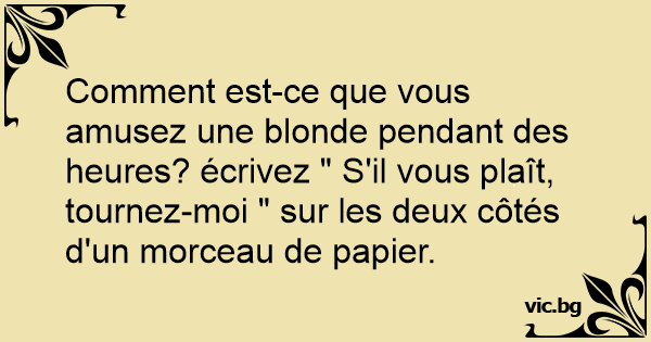 Comment est-ce que vous amusez une blonde pendant des heures? écrivez " S'il vous plaît, tournez-moi " sur les deux côtés d'un morceau de papier.