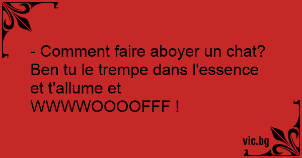 - Comment faire aboyer un chat?<br />Ben tu le trempe dans l'essence et t'allume et WWWWOOOOFFF !