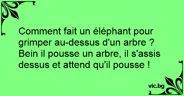 Comment fait un éléphant pour grimper au-dessus d'un arbre ? Bein il pousse un arbre, il s'assis dessus et attend qu'il pousse !