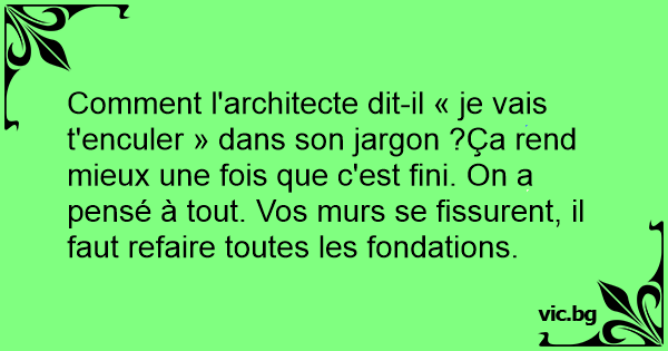 Comment l'architecte dit-il « je vais t'enculer » dans son jargon ?Ça rend mieux une fois que c'est fini. On a pensé à tout. Vos murs se fissurent, il faut refaire toutes les fondations.