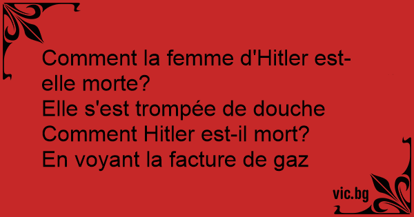 Vraag:hoe is Hitler gestorven? Antwoord:hij kreeg een hartaanval toen hij de gasrekening kreeg.