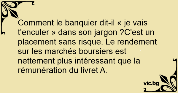 Comment le banquier dit-il « je vais t'enculer » dans son jargon ?C'est un placement sans risque. Le rendement sur les marchés boursiers est nettement plus intéressant que la rémunération du livret A.