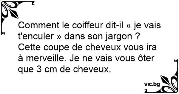 Comment le coiffeur dit-il « je vais t'enculer » dans son jargon ?Cette coupe de cheveux vous ira à merveille. Je ne vais vous ôter que 3 cm de cheveux.