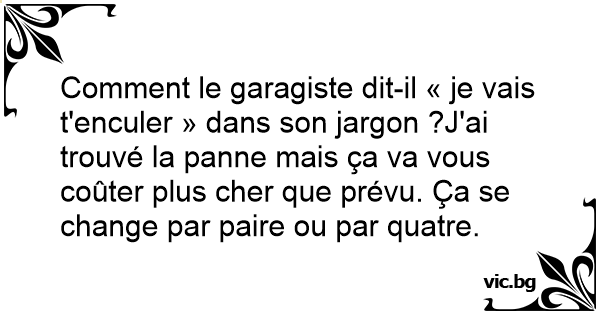 Comment le garagiste dit-il « je vais t'enculer » dans son jargon ?J'ai trouvé la panne mais ça va vous coûter plus cher que prévu. Ça se change par paire ou par quatre.
