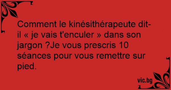 Comment le kinésithérapeute dit-il « je vais t'enculer » dans son jargon ?Je vous prescris 10 séances pour vous remettre sur pied.
