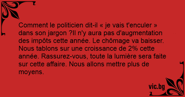 Comment le politicien dit-il « je vais t'enculer » dans son jargon ?Il n'y aura pas d'augmentation des impôts cette année. Le chômage va baisser. Nous tablons sur une croissance de 2% cette année. Rassurez-vous, toute la lumière sera faite sur cette affaire. Nous allons mettre plus de moyens.