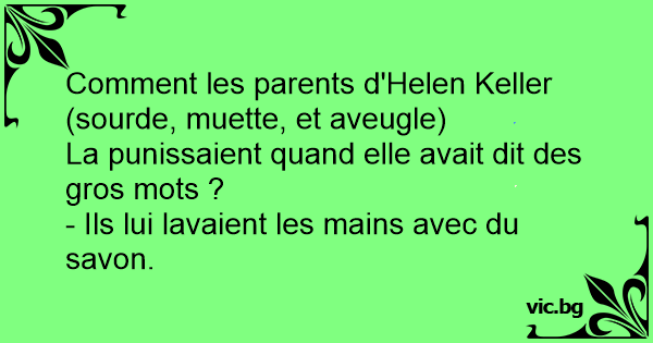 Comment les parents d'Helen Keller (sourde, muette, et aveugle) La punissaient quand elle avait dit des gros mots ? - Ils lui lavaient les mains avec du savon.