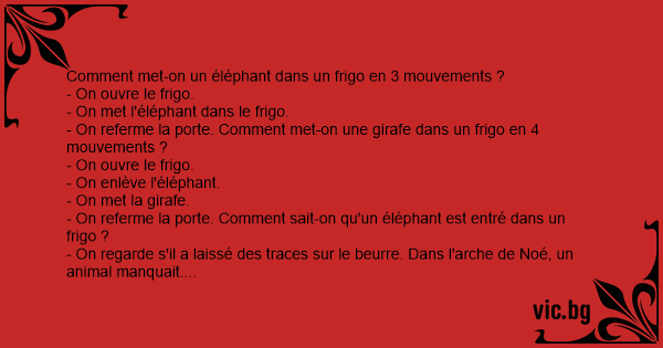 Студент е на изпит по логика. Професорът го извиква и пита: O Joãozinho pergunta para a professora: En un avion van 500 ladrillos y se cae 1, cuantos quedan? Comment met-on un éléphant dans un frigo en 3 mouvements ?, - On ouvre le frigo, - On met l'éléphant dans le frigo., - On referme la porte. One day on a plane there were 100 bricks and one fell off. How many are left? 99 What are the three steps to putting a giraffe in the fridge? 1. open the fridge 2. put the giraffe in 3.close the fridge What are the 4 steps to putting a rhino in the fridge? 1. open the fridge 2. take out the... Hvordan får man en elefant ind i et køleskab ? Man åbner køleskabet og sætter elefanten ind. Hvodan får man en giraf ind i et køleskab ? Man åbner køleskabet og tager elefanten ud og sætter... Como se coloca uma girafa dentro do frigorífico? 1. Abre-se a porta. 2. Tira-se o elefante. 3. Coloca-se a girafa. 4. Fecha-se a porta. Student: 503 bricks are on a plane. 1 falls off. How many are left? Teacher: 502. Student: How do you put an elephant in a fridge? Teacher:No you can’t fit an elephant in a fridge!! Student: Just... Time for a story: There are 500 bricks on a plane, one falls off. How many are left? What are the 3 steps to putting an elephant in a refrigerator? Open fridge, put in elephant, close fridge. What... Hvordan putter man en elefant i kjøleskapet? Svar: Man åpner døra, putter den inn og lukker igjen. Men vet du hvordan man putter en giraff inn i et kjøleskap? Svar: Du lukker opp døra, tar ut... Como se coloca um elefante no frigorifico? Abre-se a porta do VolksWagen, tira-se o elefante, fecha-se a porta, abre-se a porta do frigorífico, coloca-se o elefante dentro e fecha-se a porta. Йде іспит. Професор: — На борту літака 500 цеглин. Одна цеглина випала з літака. Скільки на борту залишилося цеглин? — Ну, це легко! 499! — Правильно. Наступне питання. Як покласти слона в... - Ile ruchów trzeba wykonać, żeby włożyć słonia do lodówki? - Trzy. Otworzyć lodówkę, włożyć słonia, zamknąć lodówkę. - A żeby włożyć żyrafę? - Cztery. Otworzyć lodówkę, wyjąć słonia, włożyć... Joãosinho pergunta para pedrinho: Pedrinho,como é que faz para colocar um elefante dentro da geladeira? Pedrinho:não sei como é que é? Joãsinho:abre a geladeira,coloca o elefante dentro e fecha a... Miten norsu saadaan jääkaappiin? - Avataan jääkaapin ovi, laitetaan norsu sisään ja laitetaan ovi kiinni. Miten kameli saadaan jääkaappiin? - Avataan jääkaapin ovi, otetaan norsu ulos, laitetaan... Шефот: Имаш 50 цигли во авион, фрлаш една,колку ти остануваат? Кандидатот: 49 Шефот: Како во три потези ќе ставиш слон во фрижидер? Кандидатот: Отворам фрижидерот, го ставам слонот внатре, го... Lentokoneessa on 503 tiiltä. Yksi niistä tippuu lentokoneesta ulos. Montako tiiltä lentokoneessa on jäljellä? - 502 Okei. Miten voit laittaa Elefantin jääkaappiin? - Avaamalla sen ja sitten laittaa...