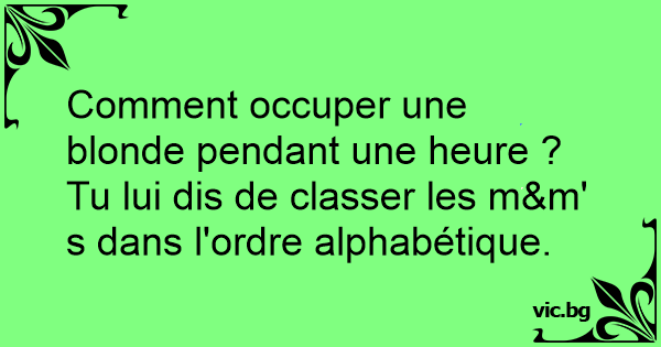 Hvordan beskæftiger man en blondine en hel aften? Man giver hende en pose m&ms og beder hende om at lægge dem i alfabetisk orden.