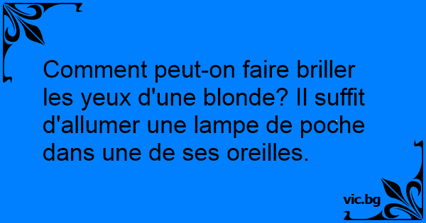 Comment peut-on faire briller les yeux d'une blonde? Il suffit d'allumer une lampe de poche dans une de ses oreilles.