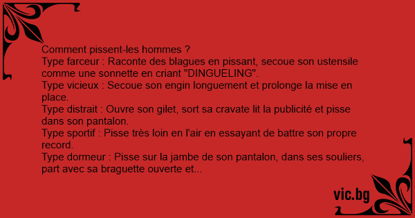 Type farceur : Raconte des blagues en pissant, secoue son ustensile comme une sonnette en criant "DINGUELING".