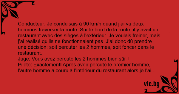 Conducteur: Je conduisais à 90 km/h quand j’ai vu deux hommes traverser la route. Sur le bord de la route, il y avait un restaurant avec des sièges à l’extérieur. Je voulais freiner, mais j’ai réalisé qu’ils ne fonctionnaient pas. J’ai donc dû prendre une décision: soit percuter les 2 hommes, soit foncer dans le restaurant.