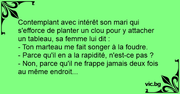 Contemplant avec intérêt son mari qui s'efforce de planter un clou pour y attacher un tableau, sa femme lui dit :
