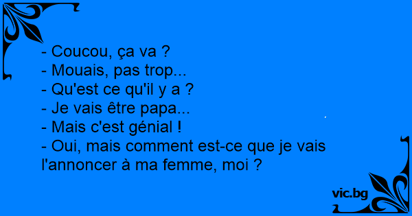 Un homme recontre un de ses potes qui fait une tête d'enterrement : " Que t'arrive-t-il ? Tu.. tu as perdu quelqu'un ?..." " Non, c'est même le contraire, je vais être père..." " Oh mais c'est super, et c'est pour ça que tu tires une gueule pareille ?!?!" " Ouais... je ne sais pas comment...