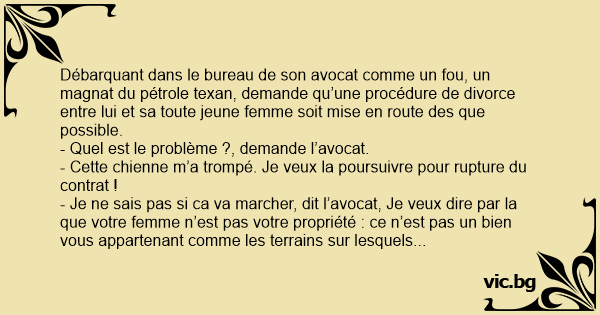 - Cette chienne m’a trompé. Je veux la poursuivre pour rupture du contrat !