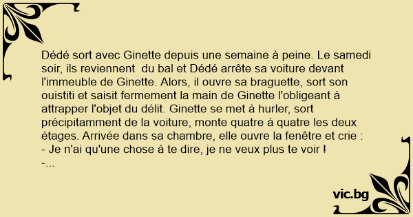 Dédé sort avec Ginette depuis une semaine à peine. Le samedi soir, ils reviennent du bal et Dédé arrête sa voiture devant l'immeuble de Ginette. Alors, il ouvre sa braguette, sort son ouistiti et saisit fermement la main de Ginette l'obligeant à attrapper l'objet du délit. Ginette se met à hurler, sort précipitamment de la voiture, monte quatre à quatre les deux étages. Arrivée dans sa chambre, elle ouvre la fenêtre et crie :