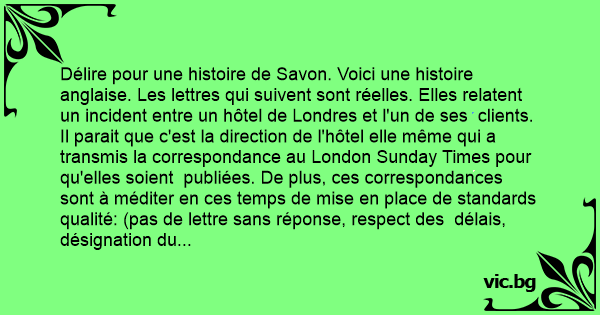 Délire pour une histoire de Savon. Voici une histoire anglaise. Les lettres qui suivent sont réelles. Elles relatent un incident entre un hôtel de Londres et l'un de ses clients. Il parait que c'est la direction de l'hôtel elle même qui a transmis la correspondance au London Sunday Times pour qu'elles soient publiées. De plus, ces correspondances sont à méditer en ces temps de mise en place de standards qualité: (pas de lettre sans réponse, respect des délais, désignation du correspondant... Tout y est ou presque!!!)