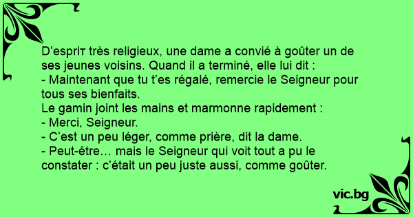 D’еsрriт très religieux, une dame a convié à goûter un de ses jeunes voisins. Quand il a terminé, elle lui dit :