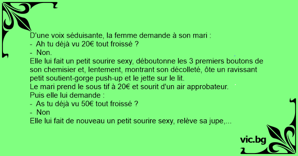 Със съблазнителен глас, жената пита мъжа си: - Виждал ли си някога 20 € са смачкани? - Не. Тя му се усмихва секси, разкопчава първите 3 копчета на блузата си бавно, показвайки циците си, сваля прекрасен малък сутиен и го хвърля на леглото. Съпругът взема сутиена и се усмихва одобрително. - А...