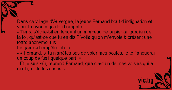 - Et je suis sûr, reprend Fernand, que c’est un de mes voisins qui a écrit ça ! Je les connais : ils sont capables de tenir leur promesse !