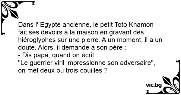 Dans l' Egypte ancienne, le petit Toto Khamon fait ses devoirs à la maison en gravant des hiéroglyphes sur une pierre. A un moment, il a un doute. Alors, il demande à son père :