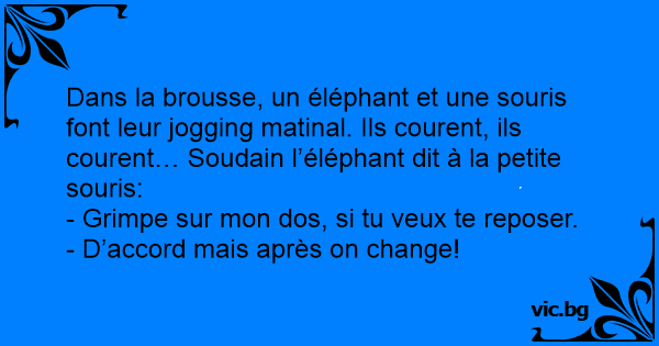 Dans la brousse, un éléphant et une souris font leur jogging matinal. Ils courent, ils courent… Soudain l’éléphant dit à la petite souris: