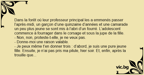- Je peux même t’en donner trois : d’abord, je suis une pure jeune fille. Ensuite, je n’ai pas pris ma pilule, hier soir. Et, enfin, après la trouille que j’ai eue, l’année dernière, quand je me suis aperçu que j’avais un mois de rетаrd, en rentrant de vacances de chez mon cousin de Bretagne, je n’ai aucune envie de repasser par de telles émotions.