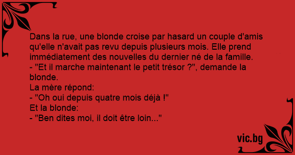 Dans la rue, une blonde croise par hasard un couple d'amis qu'elle n'avait pas revu depuis plusieurs mois. Elle prend immédiatement des nouvelles du dernier né de la famille.