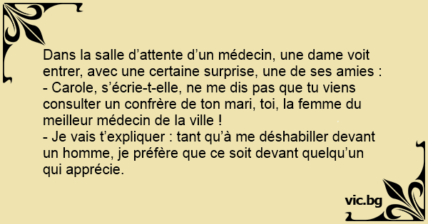 - Carole, s’écrie-t-elle, ne me dis pas que tu viens consulter un confrère de ton mari, toi, la femme du meilleur médecin de la ville !