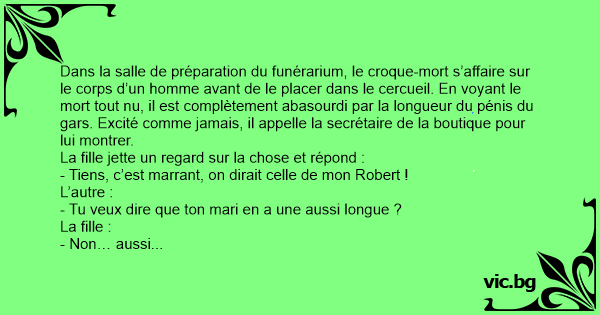 Dans la salle de préparation du funérarium, le croque-mort s’affaire sur le corps d’un homme avant de le placer dans le cercueil. En voyant le mort tout nu, il est complètement abasourdi par la longueur du pénis du gars. Excité comme jamais, il appelle la secrétaire de la boutique pour lui montrer.