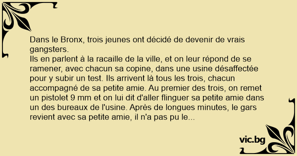 Ils en parlent à la racaille de la ville, et on leur répond de se ramener, avec chacun sa copine, dans une usine désaffectée pour y subir un test. Ils arrivent là tous les trois, chacun accompagné de sa petite amie. Au premier des trois, on remet un pistolet 9 mm et on lui dit d'aller flinguer sa petite amie dans un des bureaux de l'usine. Après de longues minutes, le gars revient avec sa petite amie, il n'a pas pu le faire. Au suivant, on soumet le même test. Mais lui non plus n'arrive pas à tuer sa petite amie pour entrer dans l'organisation du сriме. C'est le tour du troisième gars. Il s'isole avec sa petite amie. On entend plusieurs coups de feu, puis plusieurs bruits sourds. Enfin le gars tout ébouriffé sort du bureau et vient rejoindre le groupe de gangsters en disant :