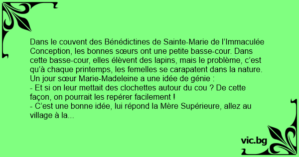 Sœur Marie-Madeleine prend son vélo et s’en va chez le droguiste. Une demi-heure plus таrd, elle revient rouge de confusion et dit à la Mère Supérieure :