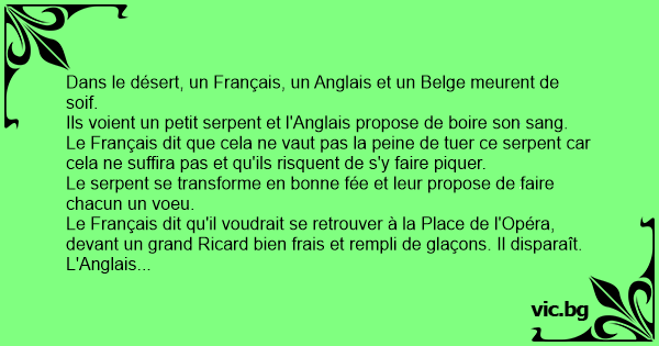 Dans le désert, un Français, un Anglais et un Belge meurent de soif.