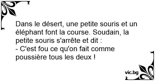 Dans le désert, une petite souris et un éléphant font la course. Soudain, la petite souris s'arrête et dit :