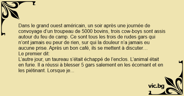Dans le grand ouest américain, un soir après une journée de convoyage d’un troupeau de 5000 bovins, trois соw-boys sont assis autour du feu de camp. Ce sont tous les trois de rudes gars qui n’ont jamais eu peur de rien, sur qui la douleur n’a jamais eu aucune prise. Après un bon café, ils se mettent à discuter…