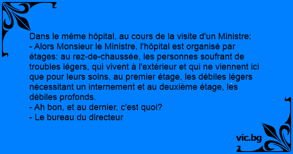 - Alors Monsieur le Ministre, l'hôpital est organisé par étages: au rez-de-chaussée, les personnes soufrant de troubles légers, qui vivent à l'extérieur et qui ne viennent ici que pour leurs soins, au premier étage, les débiles légers nécessitant un internement et au deuxième étage, les débiles profonds.