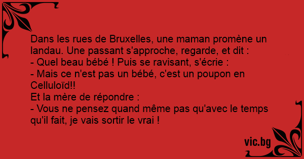 Dans les rues de Bruxelles, une maman promène un landau. Une passant s'approche, regarde, et dit :