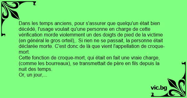 Dans les temps anciens, pour s'assurer que quelqu'un était bien décédé, l'usage voulait qu'une personne en charge de cette vérification morde violemment un des doigts de pied de la victime (en général le gros orteil),. Si rien ne se passait, la personne était déclarée morte. C'est donc de là que vient l'appellation de croque-mort.