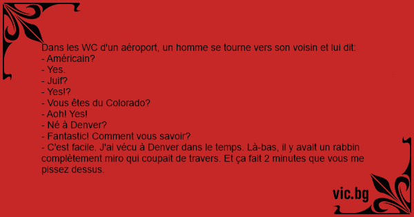 - C'est facile. J'ai vécu à Denver dans le temps. Là-bas, il y avait un rabbin complètement miro qui coupait de travers. Et ça fait 2 minutes que vous me pissez dessus.
