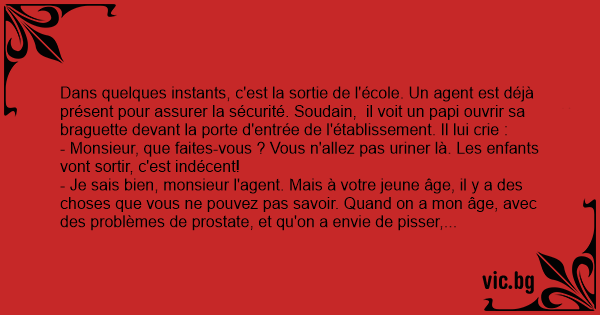 Dans quelques instants, c'est la sortie de l'école. Un agent est déjà présent pour assurer la sécurité. Soudain, il voit un papi ouvrir sa braguette devant la porte d'entrée de l'établissement. Il lui crie :