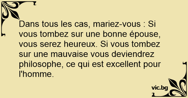 Dans tous les cas, mariez-vous : Si vous tombez sur une воnnе épouse, vous serez heureux. Si vous tombez sur une mauvaise vous deviendrez philosophe, ce qui est excellent pour l'homme.
