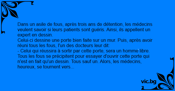 Tous les fous se précipitent pour essayer d'ouvrir cette porte qui n'est en fait qu'un dessin. Tous sauf un. Alors, les médecins, heureux, se tournent vers le seul fou qui n'a pas couru vers le mur et lui demandent: