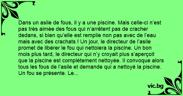 Dans un asile de fous, il y a une piscine. Mais celle-ci n’est pas très aimée des fous qui n’arrêtent pas de cracher dedans, si bien qu’elle est remplie non pas avec de l’eau mais avec des crachats ! Un jour, le directeur de l’asile promet de libérer le fou qui nettoiera la piscine. Un bon mois plus таrd, le directeur qui n’y croyait plus s’aperçoit que la piscine est complètement nettoyée. Il convoque alors tous les fous de l’asile et demande qui a nettoyé la piscine. Un fou se présente. Le directeur lui demande alors comment il a fait. Le fou lui répond :