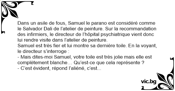Dans un asile de fous, Samuel le parano est considéré comme le Salvador Dali de l’atelier de peinture. Sur la recommandation des infirmiers, le directeur de l’hôpital psychiatrique vient donc lui rendre visite dans l’atelier de peinture.