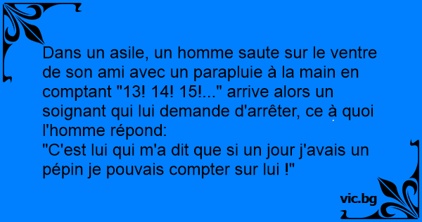 Dans un asile, un homme saute sur le ventre de son ami avec un parapluie à la main en comptant "13! 14! 15!..." arrive alors un soignant qui lui demande d'arrêter, ce à quoi l'homme répond: